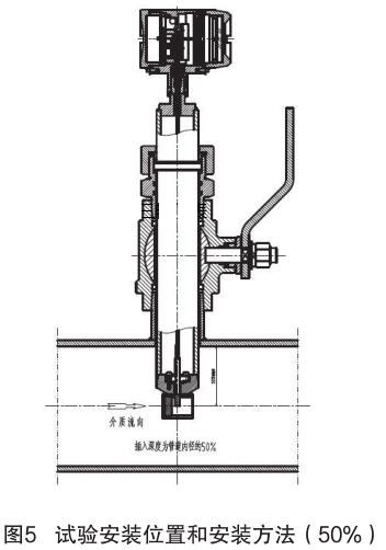 對插入式壓縮空氣流量計和插入式電磁流量計的結(jié)構(gòu)原理進(jìn)行分析,插入式電磁流量計的信號采集點(diǎn)在標(biāo)校管道內(nèi)12.5% 為宜,因它屬電磁類流量計,而壓縮空氣流量計是根據(jù)“卡門渦街”原理進(jìn)行測量管道內(nèi)流量,根據(jù)標(biāo)校管道內(nèi)層流和湍流的分析,以及插入式壓縮空氣流量計獨(dú)特的探頭結(jié)構(gòu)形式,確定插入式壓縮空氣流量計的插入深度為標(biāo)校管道內(nèi) 50%,試驗安裝位置和安裝方法如圖 5 所示。